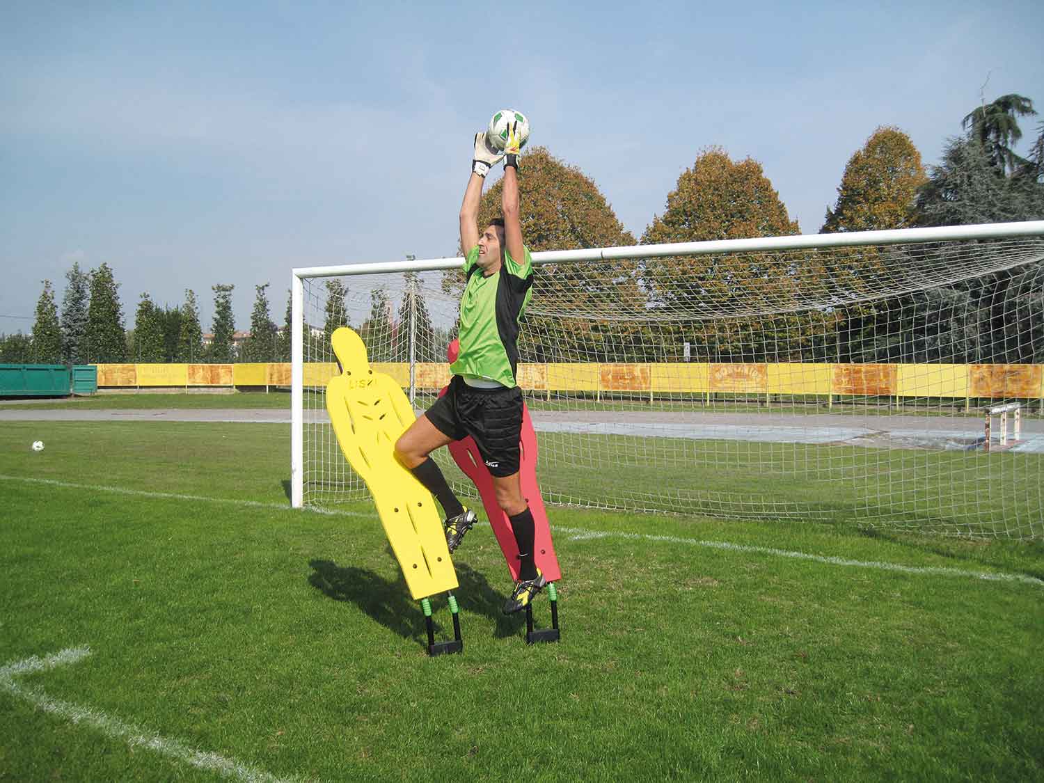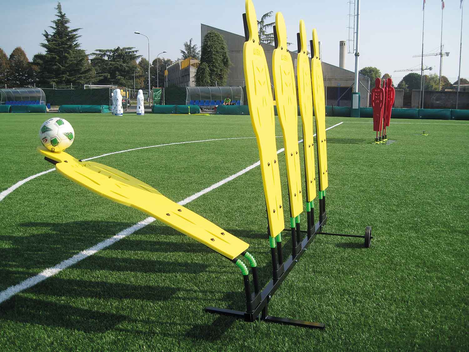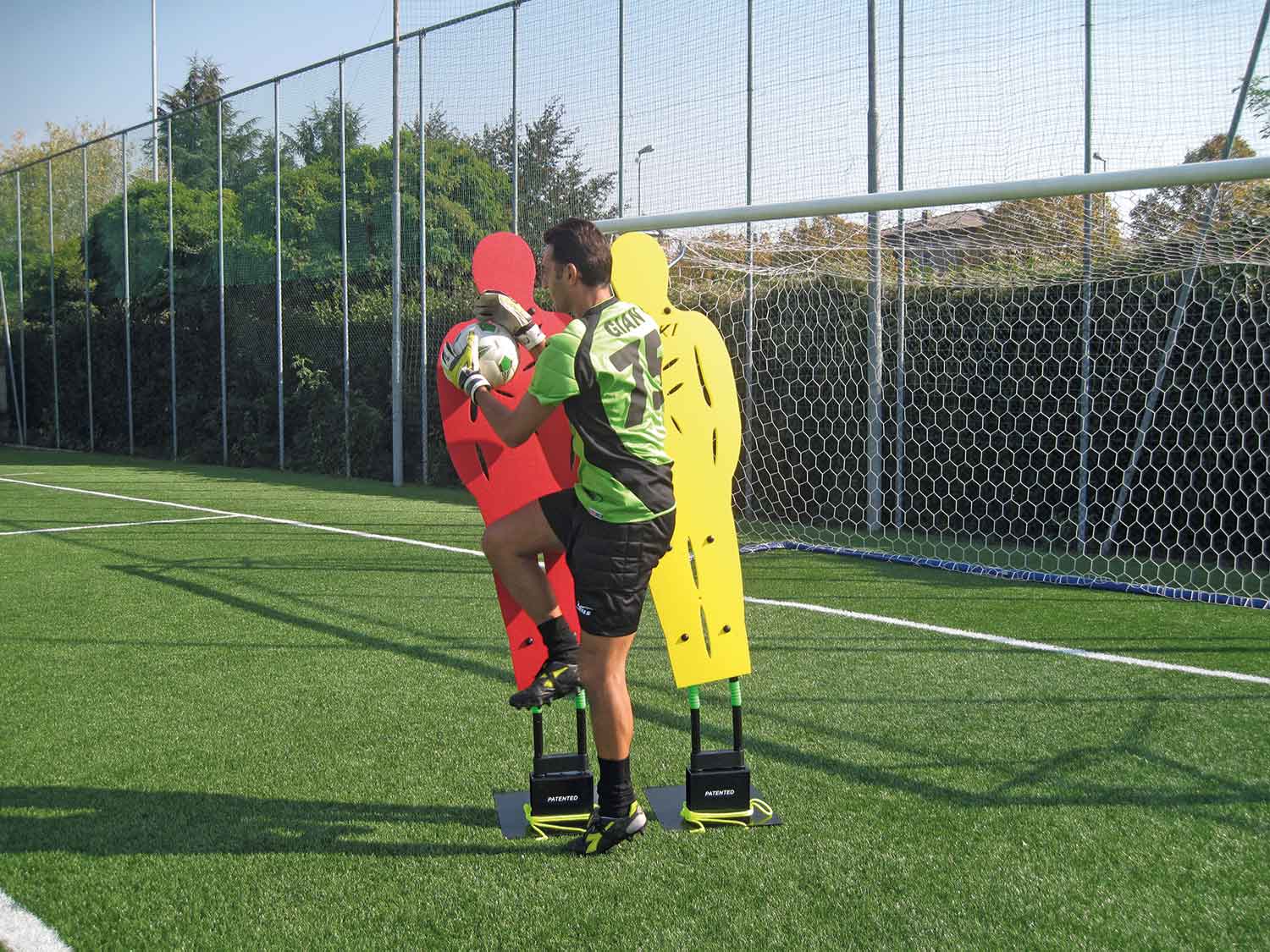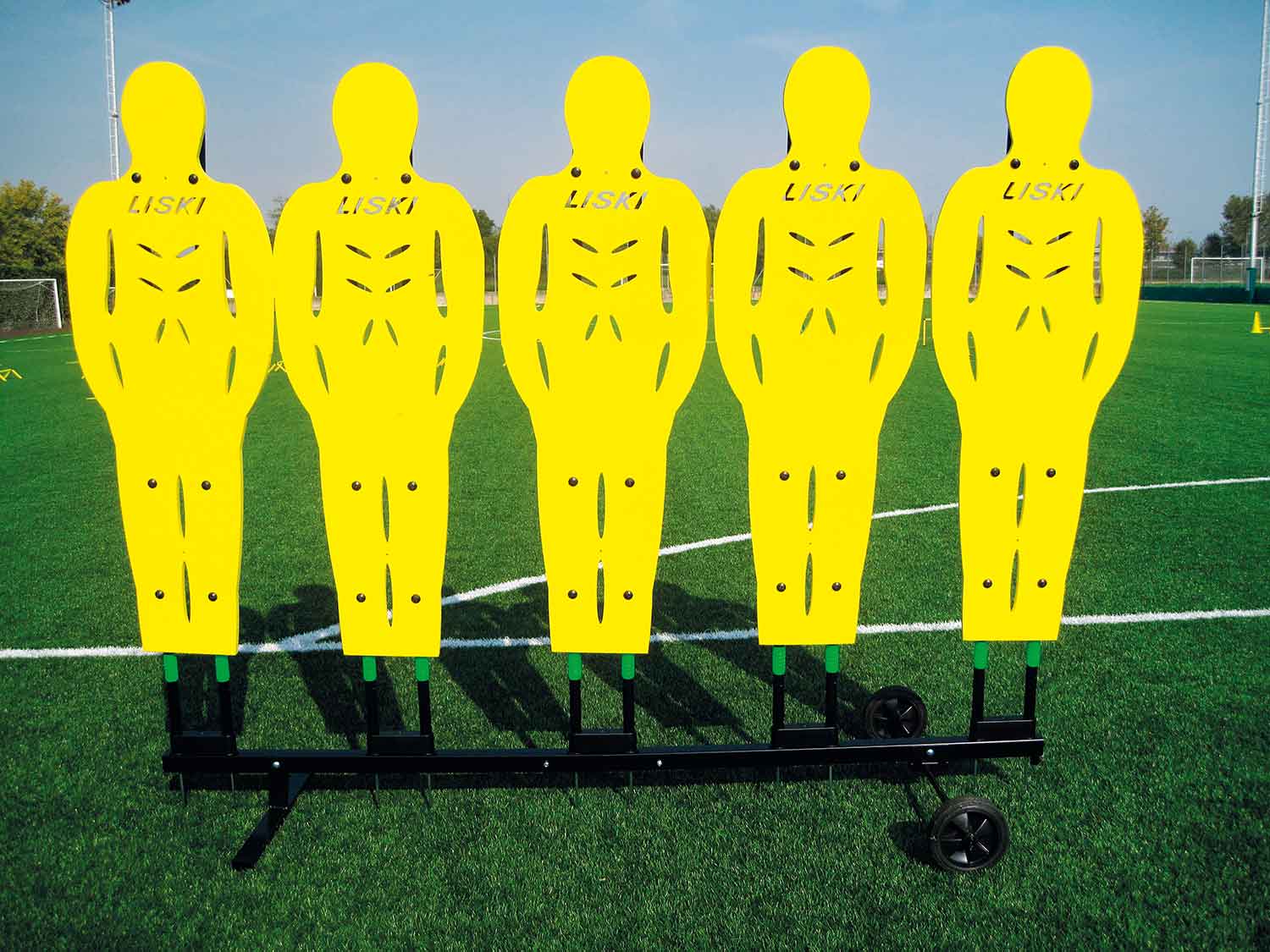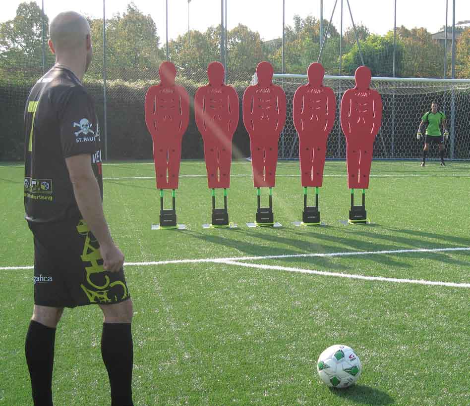Die Freistoßmauer besteht aus 5 höhenverstellbaren Dummies mit Kippgelenk.