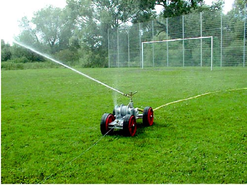 Selbstfahrend auf 4 Rädern, für die automatische Beregnung von großen Rasenflächen wie Fußballfelder, Tennis- und Golfplätze oder Parkanlagen etc.